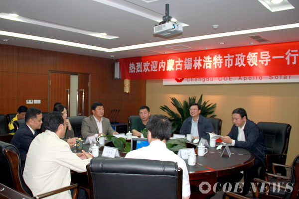 ????? 10月9日上午,在中建集團董事長宋志平安排下,蚌埠院院長彭壽指導(dǎo)下,院常務(wù)副院長茆令文的陪同下,內(nèi)蒙古錫林郭勒盟盟委委員、錫林浩特市委書記寇小平,錫林浩特市委副書記、市長閆宏光,副市長簡順利,市政協(xié)副主席、發(fā)展改革局局長徐桂英,發(fā)展改革局書記、副局長王占奇,內(nèi)蒙古大業(yè)投資集團有限責任公司董事長劉兢海、副董事長郝廣平一行蒞臨我公司參觀考察。公司董事長兼總經(jīng)理侯仁義、常務(wù)副總謝義成、董事王獻峰、行政副總經(jīng)理劉家林、財務(wù)總監(jiān)王泓濤、副總工程師傅干華等陪同參觀考察,美國碲化鎘薄膜太陽能電池研究中心潘錦功博士等參加座談。
