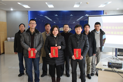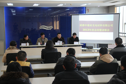 ?????2014年1月13日,成都中建材光電材料有限公司召開2013年度總結(jié)暨表彰會(huì)??偨?jīng)理潘錦功、常務(wù)副總經(jīng)理謝義成、副總工程師傅干華、財(cái)務(wù)部長(zhǎng)許躍云及全體員工參加了會(huì)議。