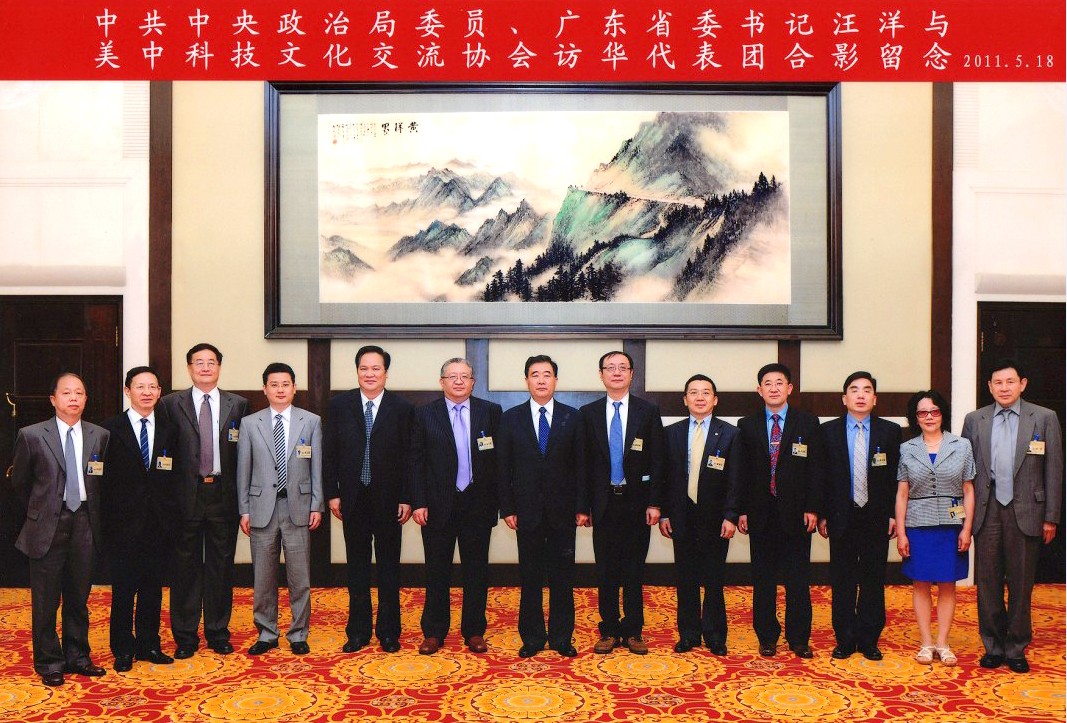 圖為:中共中央政治局委員、省委書(shū)記汪洋與美中科技文化交流協(xié)會(huì)訪華代表團(tuán)合影留念?潘錦功博士(右五)